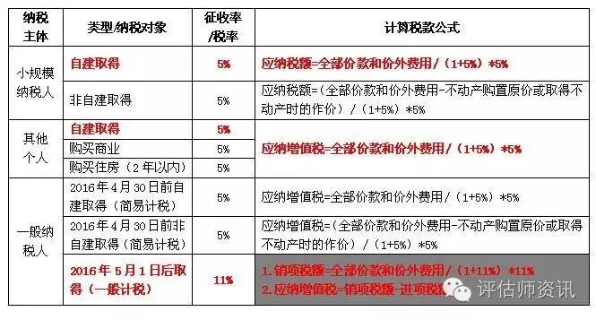 如產(chǎn)權(quán)人(納稅主體)為一般納稅人,由于現(xiàn)階段難在計算出增值稅進項稅額,也就是可抵扣進項稅基本無法準確測算或者客觀反映,可操作性差,因此,我們建議參照小規(guī)模納稅人以自建方式取得的方式測算或一般納稅人中的簡易計稅方式。即實際估價中,暫時統(tǒng)一按以下可操作性強口徑計算:
