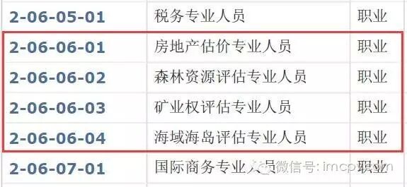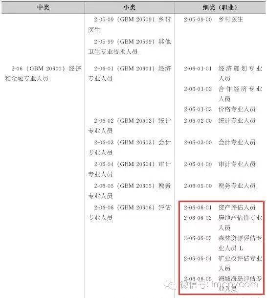 2015版《職業(yè)分類大典》延續(xù)職業(yè)分類的大類、中類、小類和細(xì)類結(jié)構(gòu),細(xì)類是最基本的類別,即職業(yè)。評(píng)估專業(yè)人員為本次新增小類,與統(tǒng)計(jì)專業(yè)人員、會(huì)計(jì)專業(yè)人員和審計(jì)專業(yè)人員等同屬第二大類“專業(yè)技術(shù)人員”、中類“06經(jīng)濟(jì)和金融專業(yè)人員”,小類編碼為06。評(píng)估專業(yè)人員的細(xì)類(職業(yè))共有5種:分別為資產(chǎn)評(píng)估人員、房地產(chǎn)估價(jià)專業(yè)人員、森林資源評(píng)估專業(yè)人員、礦產(chǎn)權(quán)專業(yè)評(píng)估人員和海域海島專業(yè)評(píng)估人員。